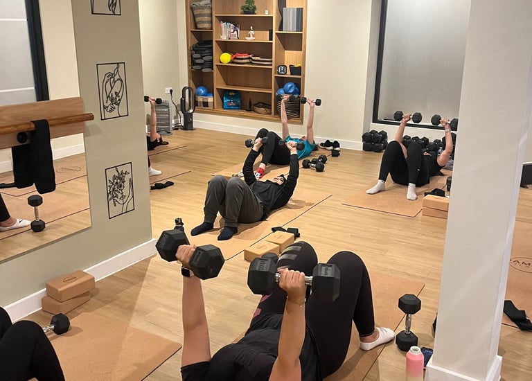 We offer both traditional Pilates and Dumbbell Pilates, where light weights are incorporated into classic movements to add an extra strength and stability challenge while maintaining precision and control.